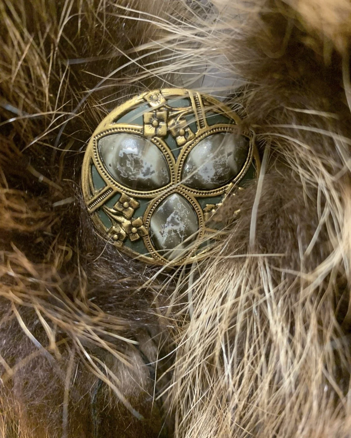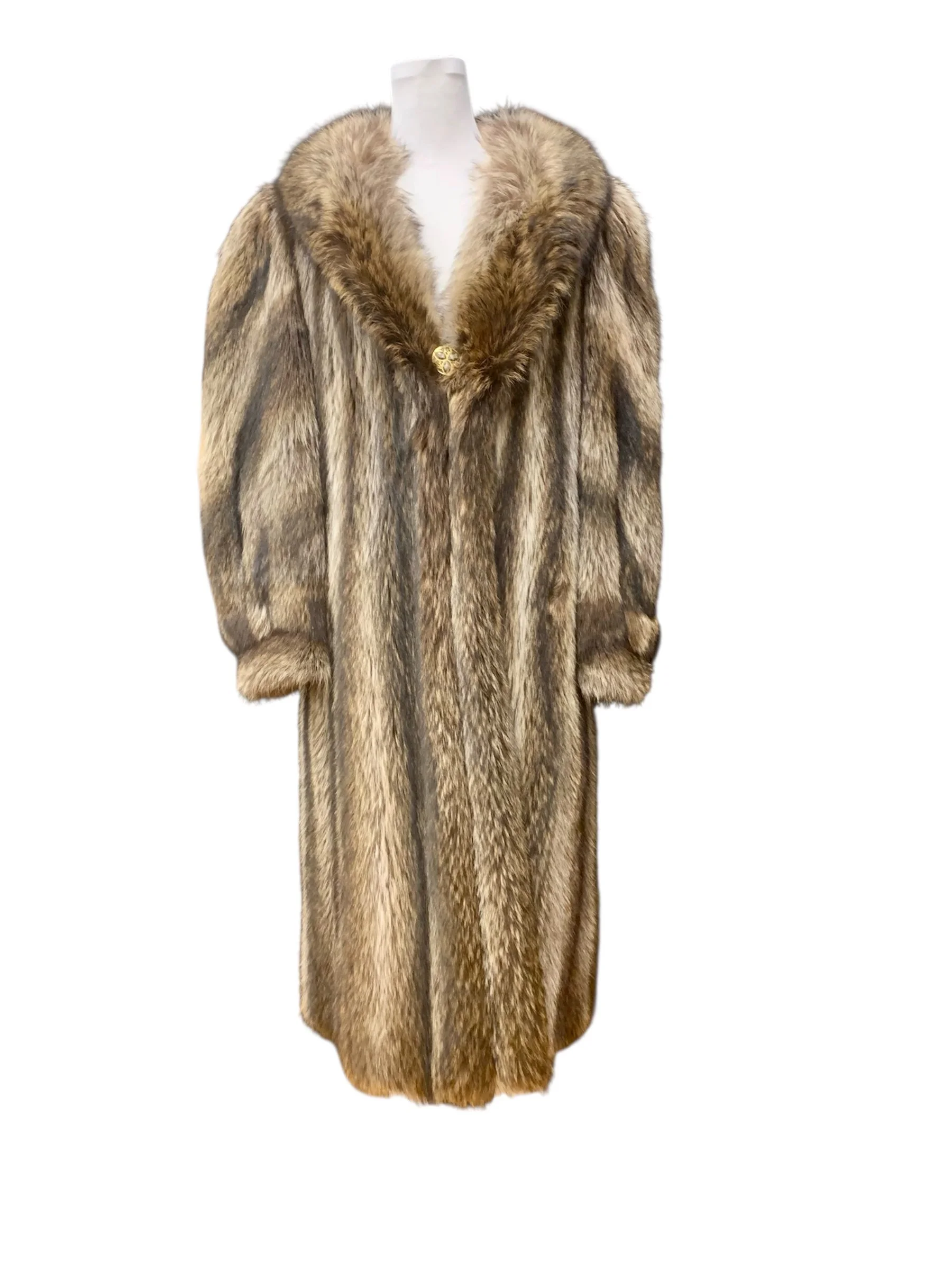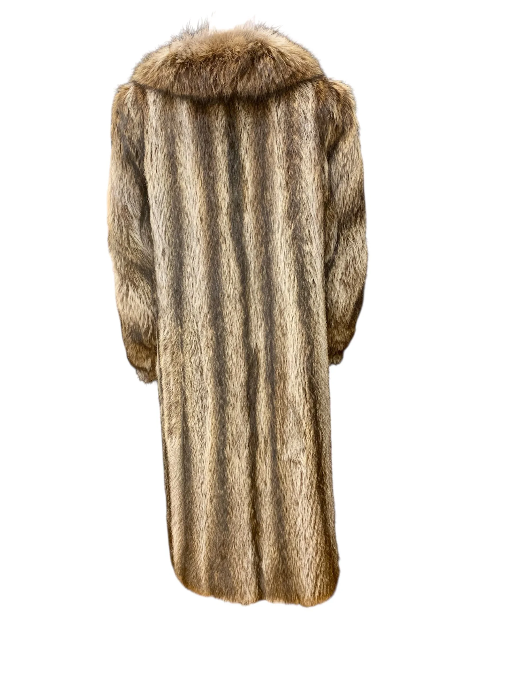 This dramatic, luxurious vintage raccoon fur coat features a rich, natural striping pattern with full sleeves, a wide shawl collar and an ornate oversized button to close. Label reads R. F. C. No. 1112. Fully lined with satin. Original lining has been replaced with new satin in a 3.5' wide section running down the centre back seam.